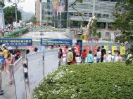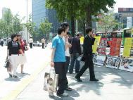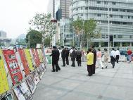 每天中午的11点到下午2点,是流动人员最多也是工作人员休息的时间,在使馆大楼和金融大楼的前面,法轮功学员们首先架起一道“真象墙”,那是用近四十块图片展板组成的,中间是法轮大法弟子在中国遭受迫害的真人模拟酷刑演示。