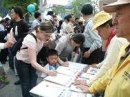 天气越来越热,参加模拟酷刑演示的学员们一动不动的坚持几个小时,很多观众纷纷问:“这是真人吗?”学员们讲:“这是真人,并且更残酷的迫害天天在中国发生,已经持续六年了。我们在这里把中共对法轮功的迫害揭露出来,呼吁善良的人们联合起来,帮助制止正在中国发生的这种人权迫害。”
