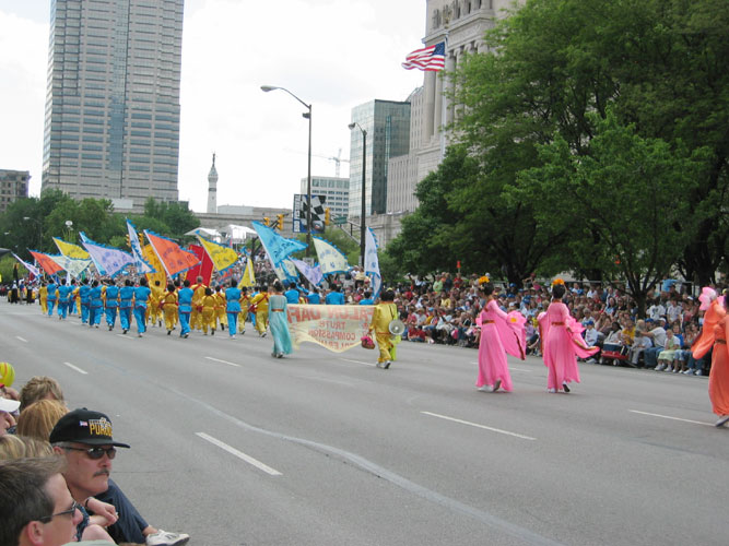 本次游行还有一个特点是每隔100米即有一个解说台,每当法轮大法学员的队伍经过时,解说台就向周围的观众介绍到:“让我们一起欢迎美中法轮大法协会的团体,28名鼓手和28名旗手今天穿着中国传统的服装组成的“威风旗鼓阵”真是太美了。法轮功,又称法轮大法,起源于中国古老的修炼方法,修炼“真善忍”宇宙特性,包括打坐和炼功。1992年在中国传出后,几年时间就有上亿人修炼,现在全世界有60多个国家的人在学习法轮大法。感谢你们来到印第安纳州!” 就这样在场的30万观众全部都听到了法轮大法的介绍,二英里长的游行路程中从头到尾,所到之处掌声迭起,欢声雀跃。观众向队伍挥手致意,有的甚至合十感谢。