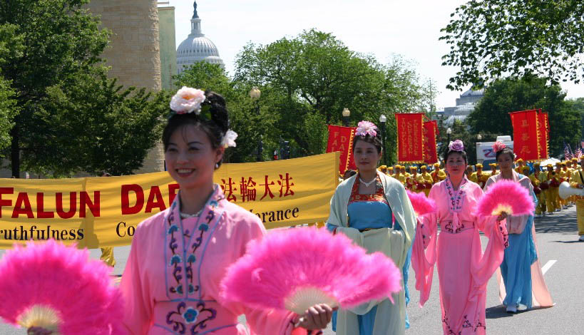 这些法轮功学员中有大学教授、医生、电脑专家、家庭主妇、学生和退休老人。他们以乐观祥和的精神风貌、亮丽的服装,以及优美的舞姿与功法演示把真善忍精神和中国传统文化传入西方社会,自1999年4月樱花节以来,法轮功学员的游行队伍活跃于华府各种社区庆祝活动和节日游行中,成为一道亮丽的风景线。