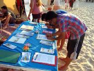 当天天还未完全亮,大家就开始准备真象资料、展板和反酷刑展所需要的材料,各炼功点的学员也到来配合帮忙化妆和演示酷刑。随着天渐渐亮,人潮越来越多,许多经过活动地点的人,都很惊讶的看见这些真人模拟酷刑的演示,纷纷停下脚步探个究竟,一些以往对法轮功学员们炼功视若无睹的人也过来了解真象。学员们一一向他们讲清真象,发简介和真象光盘,并请他们签名支持向国会议员呼吁帮助停止在中国对法轮功学员的迫害。