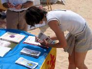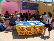 展台刚刚搭起不久,一位身着白装的女士口里大声念着“法轮功”、径直走到我们展台后面的教功现场与我们一位学员热烈拥抱,像是多年的老朋友久别重逢一般。原来这位女士去年年底曾经参加圣地亚哥市长竞选并对现任市长的当选构成巨大威胁。目前现任市长已经正式宣告辞职,所以这位女士将于夏天再次参加竞选。她说,我早就知道法轮功好,如果我当选,我一定要在圣地亚哥大力提倡法轮功。