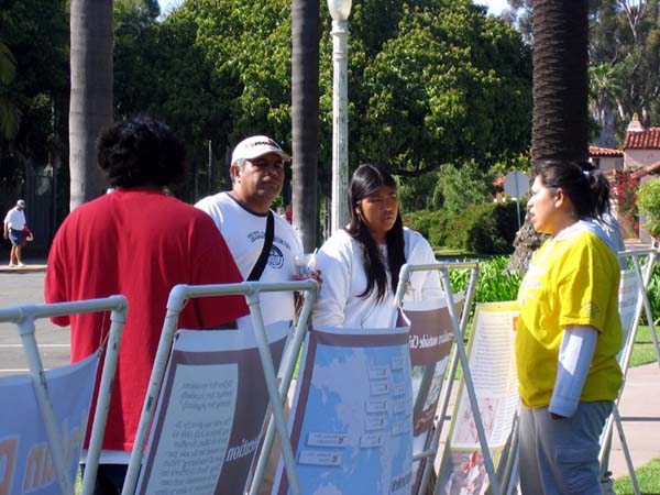 【明慧网2005年5月4日】五月一日星期日,美国加州圣地亚哥市春光明媚、风和日丽,几百个参展单位、六万多本地市民及来自世界各地的游客、兴高采烈的来到著名的巴波亚公园(Balboa Park),参加在这里隆重举行的一年一度的地球日庆祝活动。