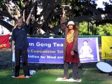 ![]() 将法轮功的美好介绍给大家 | ![]() 3位学员在台上展示美好祥和的功法时,台下许多民众跟着学习 |