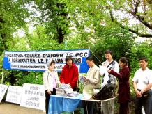 二零零五年五月三日,法国法轮功学员及支持者,在新加坡驻法使馆前请愿,呼吁新加坡政府秉持公正,不要追随中共、助纣为虐,停止参与迫害法轮功;并向使馆递交了请愿信。