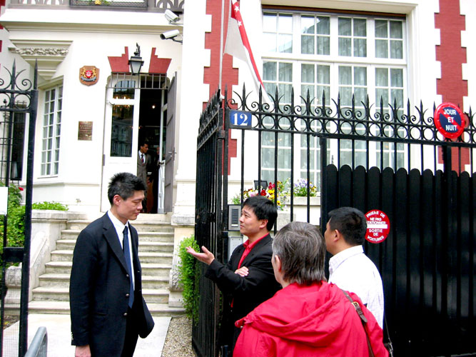 法国法轮大法协会主席向新加坡驻法使馆官员指出,新加坡政府所为,好比警察把深夜遇难呼救的人以“打扰他人”的名义治罪,十分荒唐。