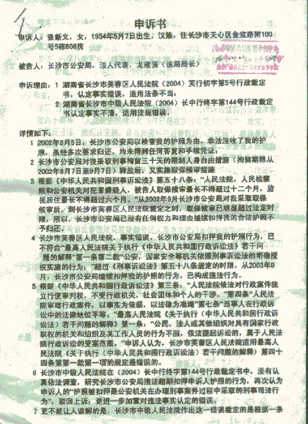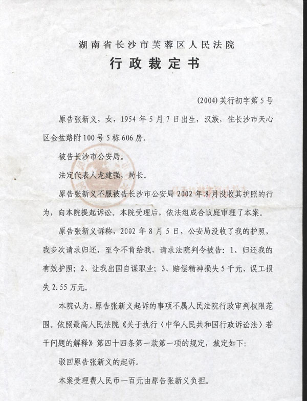 张新义要求长沙市公安局归还护照、并诉诸法院,却遭法院以“非行政审判权限范围”为由驳回。