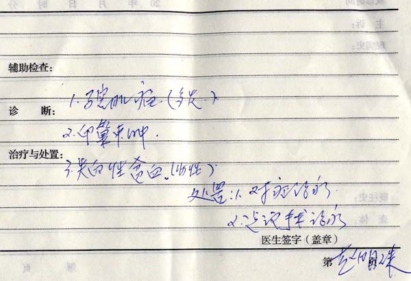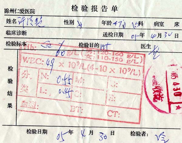 就这样,我不吃不喝躺了十天后,女儿从外地回来了,见我这样,非常痛心,当晚叫了一辆的士,将我送到了县城医院。女儿对我说:“妈,咱就照一下片,要没事就回家。”结果照片显示颅内大出血,70%脑组织受到不同程度的损伤,右臂粉碎性骨折,右肋骨断了两根。医生说可能会有生命危险。这可吓坏了丈夫和儿女们。但我从来不把自己当作一个有病的人,五天后我回到了家里。