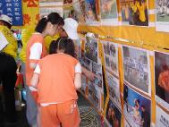 他不停的对着法轮功学员们的反酷刑展拍照长达一个多小时。