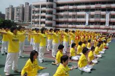 2005年5月7日,一个晴空万里的天气,台北县土城市广福国小的操场上热热闹闹的,土城市大家长、市民代表及嘉宾们也都到场,许多人忙里忙外的,忙着排练表演及园游会摊位的准备,一个身穿印着“法轮大法”黄色上衣,非常恬静的五岁小女孩特别引人注目,原来法轮功学员也受邀打腰鼓及功法表演,有老有少,有80多岁的伯伯,有5、6岁至国中的小朋友,大家一同庆祝广福国小创校20周年校庆。