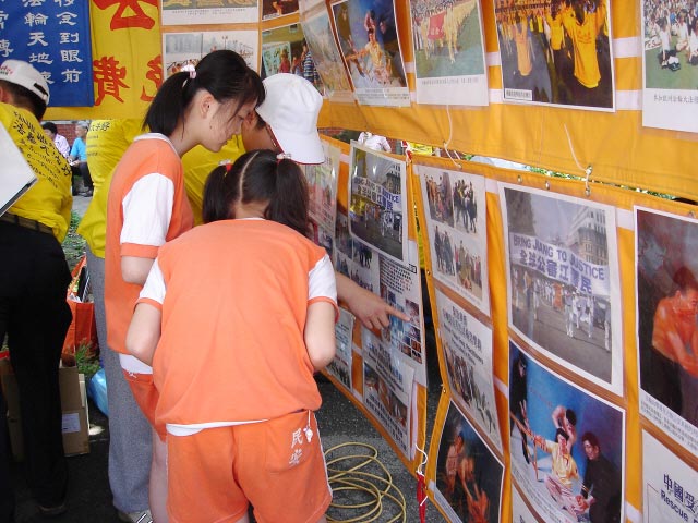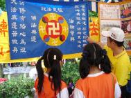 【明慧网2005年5月9日】2005年5月7日是台湾台北县民安国小44周年的校庆,在下了一整夜的大雨后,天空开始放晴,晴朗的天空带着凉爽的微风。这次的运动会校方特别为法轮功团体安排了一个摊位,在摊位上不时有学童及家长前来认识法轮大法,学员们对活泼的小朋友也相当有耐心的一一讲解图片上的故事,带着小朋友念着中的诗句,小朋友也很开心的在镜头面前高兴的呼喊法轮大法好。