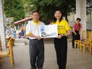 小朋友认真学习《洪吟》诗句 |  校方颁发锦旗给法轮功学员 |  法轮功学员回赠校方真善忍海报 |