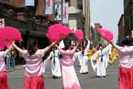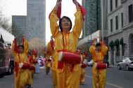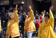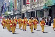 游行队伍行進途中许多市民在欣赏腰鼓和舞蹈队的表演后,更是认真的观看法轮功受迫害的真象展板。展板上展示出停止对法轮功的迫害和营救受迫害的法轮功学员和他们的孤儿的呼声。接看法轮功学员发的真象资料的人越来越多。
