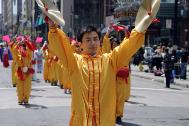 善良的人们会感受到法轮大法带来的美好,有些人不时的向游行队伍合十。