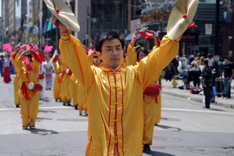 在准备游行的起点,发生一件好笑又令人感伤的事情:一位从新加坡移民加拿大的法轮功学员推着她近一岁的女儿前来参加游行。这是她在加拿大第一次参加法轮大法的活动,当她看到警察过来时非常紧张的跟周围的同修说:“警察来了。”看到她紧张的神情周围的人开始有些不解,当得知她是从新加坡来的,大家沉默了。
