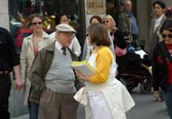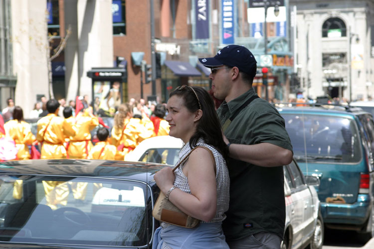 游行途中遇到四位出公差的中国人,他们对法轮功并不陌生,而且态度非常友好,其中三位一直在饶有兴趣的拍照。他们说,象他们这样常出国的人都知道法轮功是怎么回事。