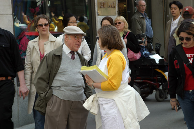 在中国城附近,有三位康戈迪亚(Concordia)大学的中国访问学者在寻找他们的同事――法轮功学员、康戈迪亚(Concordia)大学博士后竹先生。其中两位与竹博士在同一办公室,他们对法轮功的真实情况有所了解,并理解和支持法轮功学员的信仰。看到竹博士,他们说,我们想今天应该能看到竹博士。说话间两个人都看到在他们的周围有许多金黄色的东西。另外那位则不相信,还笑话他们。其中一位急得说:“我都四十多岁了,还能骗你吗?!”