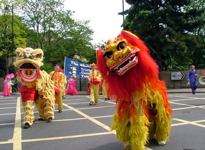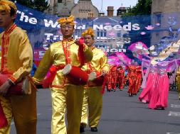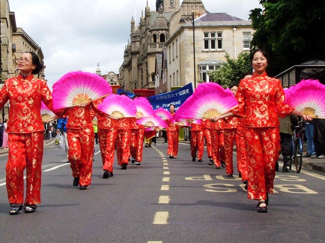 庆典游行于中午时分开始,整个游行队伍浩浩荡荡的穿过牛津城的市中心,途中经过了繁华热闹的步行商业街和牛津市政厅。热闹的游行队伍中,别具东方风采的法轮功团队颇为引人注目。法轮功队伍由手持“真、善、忍”三个大字的小弟子们领队,紧随的是“法轮大法好”的横幅。其后是两只雄风奕奕的狮子表演舞狮,然后是具有中华传统民俗色彩的腰鼓队及绸扇舞队,“世界需要‘真、善、忍’”和“法轮大法洪传全世界六十多个国家”的中英文横幅,以及色彩鲜艳的法轮旗,穿插在队伍中,颇显气势。舞绸扇的学员们随着“法轮大法好”的歌声翩翩起舞--“法轮大法好,法轮大法好,法轮大法是正法,佛光普照。”优美的歌声回响在牛津古城的街道上,也将大法弟子的心声传送给了牛津市民和远道而来的游客。精神抖擞的腰鼓队,温文尔雅的绸扇舞,凛凛正气的法轮大法横幅,法轮功学员的精神风貌给沿途观众留下了深刻的印象。队伍所过处,不时有阵阵掌声响起。