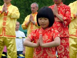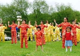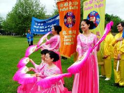 游行结束后,各游行团队来到市区旁的绿地,继续下一步的庆祝活动。各团队有各自的展位,绿地中心设有“舞台”供各团队表演或展示。法轮功学员们为其他游行队伍及观众展示了法轮大法的五套功法。功法表演结束时,场地四周响起了热烈的掌声。