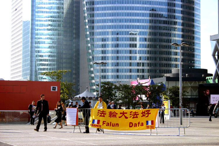 这里法国和世界级的大公司很多,上下班高峰期间和午餐时间白领阶层人潮如流。尽管他们步履匆匆,但法轮功学员的横幅和展板吸引了他们的视线。很多人接传单,有的边走边看起来,有的向学员询问详情,有的签名表示支持法轮功学员、反对迫害。