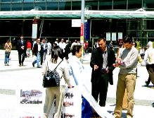 国家工业与技术中心前的广场上人潮如流,法轮功学员在此讲真象