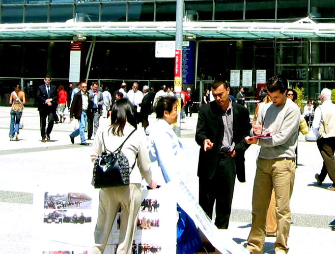 中午时分,一个参加汽车工业大会的法国人兴冲冲的走到信息桌前,他说他早晨拿了传单和起诉王云坤的新闻公告,他觉得应该让更多的法国同事知道,于是拿了几张放到大会的咖啡厅里。学员同时请他转告王云坤:如果他还不明白法轮功,请他到法轮功的网站上去了解。如果他知道法轮功是什么,叫他不要继续迫害法轮功了。他连连点头答应了。真是个明白人。