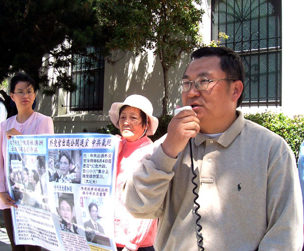 【明慧网2005年6月12日】(明慧记者黄凯莉旧金山报导)就日前中共官员陈用林、郝凤军相继公开脱离中共,并揭露中共对法轮功的迫害,2005年6月10日,部份法轮功学员参加在旧金山中领馆前的新闻发布会,对二人的正义举动表示支持,并以亲身经历揭露中共的恶行;同时呼吁其他中共官员,包括旧金山中领馆的官员也早日脱离中共,勿继续当中共的帮凶。
