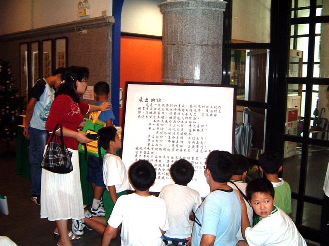 ![]() 小学生到画展现场参观并写心得 | ![]() 学生专注的听导览人员讲解 |
