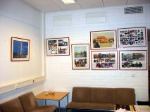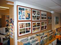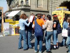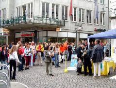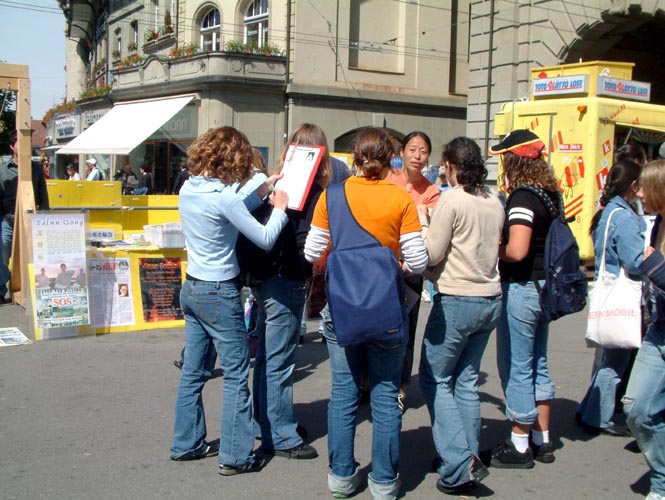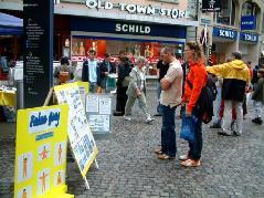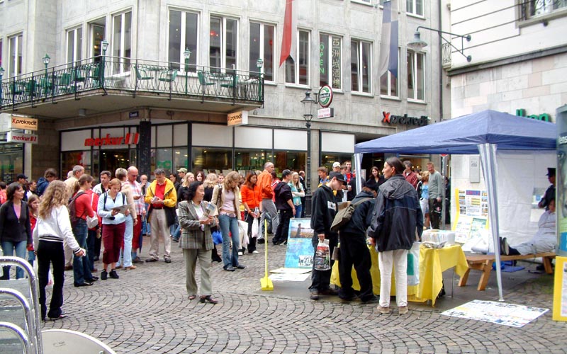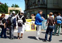 学员也摆放了摊位,并挂上“法轮大法好”的横幅;横幅下边是揭露法轮功在中国受迫害的图片和说明;横幅的旁边放了一张桌子,上面放着一块用于签名的白色长布。有的学员发正念,有的发真象资料,有的炼功,有的向前来街市的民众讲真象。