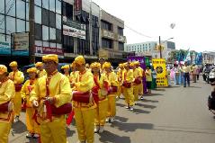 ![]() 法轮功队伍沿着拥挤的商业区街道游行 | ![]() 两块展现法轮功洪传全世界画面的巨型展牌伫立在河上 |