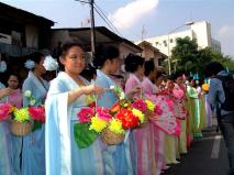 ![]() 四位“哪吒”装扮的小朋友 | ![]() 法轮大法队伍成为焦点风景 | ![]() 记者们忙着为“散花仙女”录像摄影 |