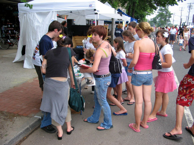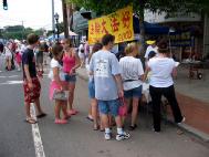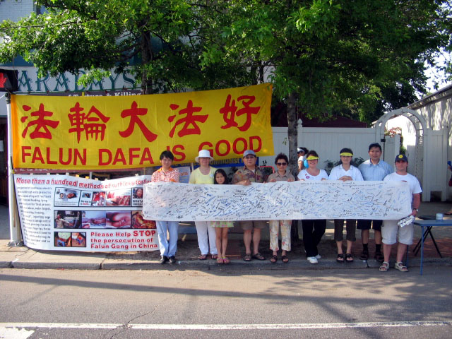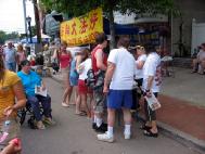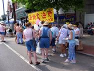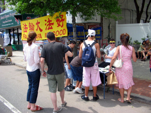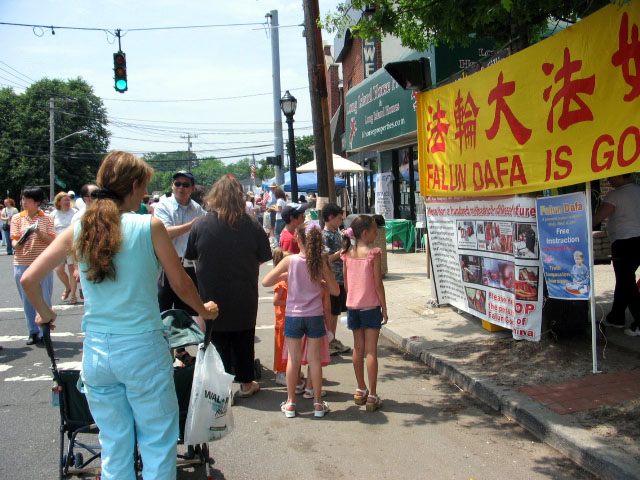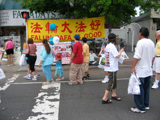 【明慧网2005年6月15日】美国纽约长岛史密斯镇于2005年6月12日迎来了一年一度的街市节(“Smithtown Annual Festival Day”),来自长岛400多个公司和个体商家,一大早就摆好了摊位,显示出热热闹闹的气氛,长岛法轮功学员也来到这里。学员先将真象资料送给了各个商家;百分之九十八的商家非常高兴的接过了资料,并认真的看起来。
