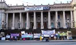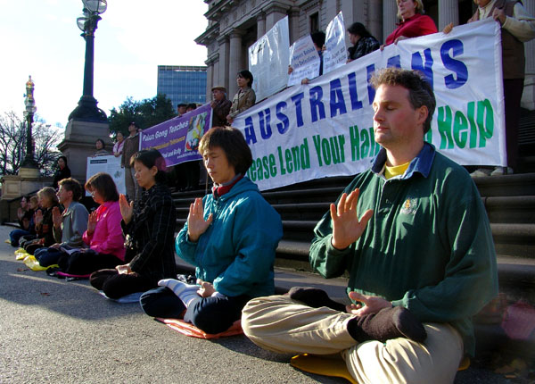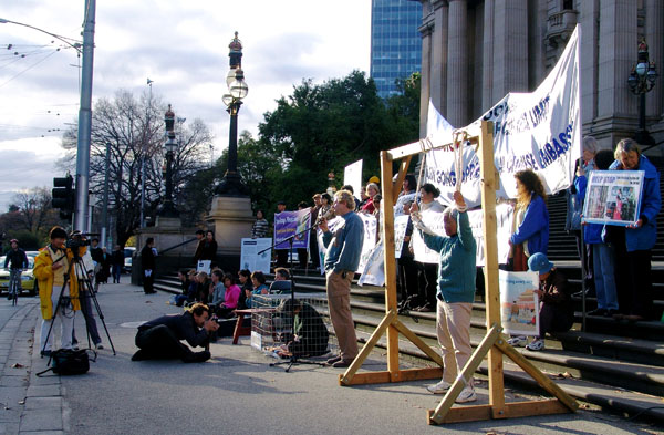 【明慧网2005年6月15日】2005年6月11日下午,数十名澳洲墨尔本法轮功学员在维多利亚议会大厦门前集会,声援章翠英、戴志珍两位法轮功学员起诉澳洲外长唐纳,并要求其撤销对法轮功和平请愿的限制。