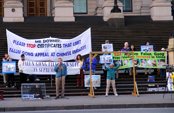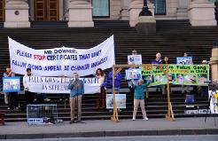 学员们打出横幅:“唐纳先生请停止签发限制法轮功学员在中国大使馆前请愿的指令”、“澳大利亚,请伸出援助的手”、“澳洲最高法院已接受法轮功起诉外长唐纳案”、“营救在中国遭受酷刑的法轮功学员”。