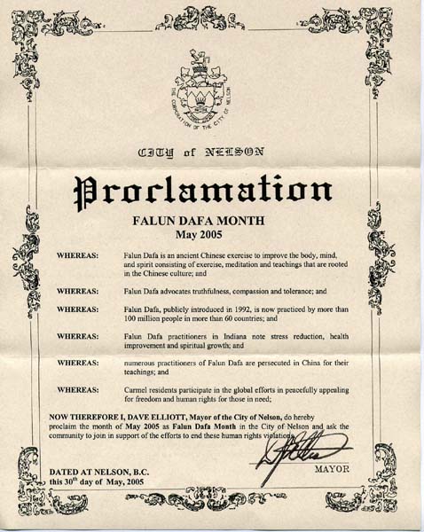 因此,我,Dave Elliott,Nelson市市长,特此褒奖2005年5月为Nelson市“法轮大法月”并请社区共同加入制止人权侵害的努力。