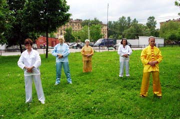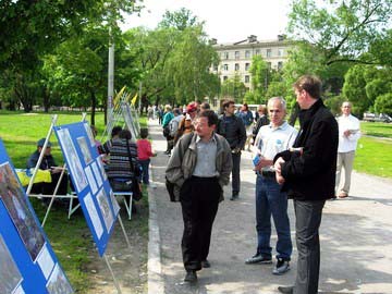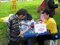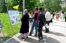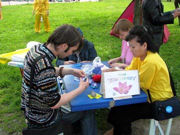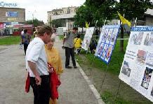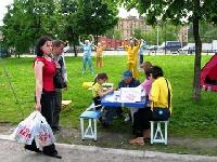这一天阳光明媚,这样的天气在彼得堡市是不常有的。法轮功学员们展出了5个大型的介绍法轮大法真象的展板,有介绍大法洪传世界、法轮功学员在中国遭受迫害的图片和澳洲画家章翠英的画。活动中,学员们还有教感兴趣的路人叠纸莲花。