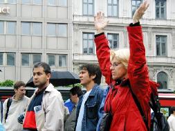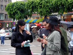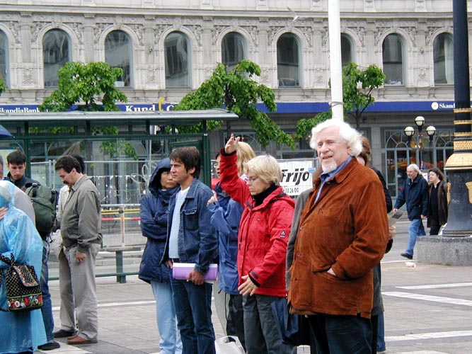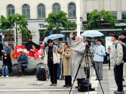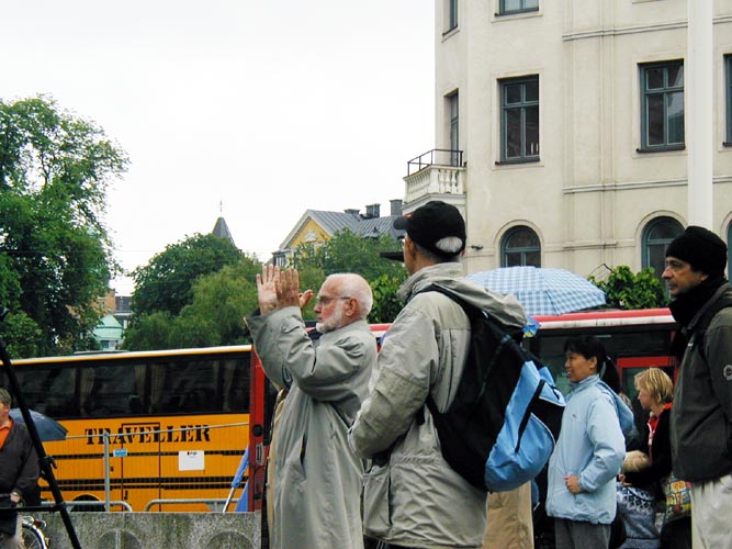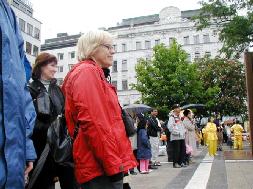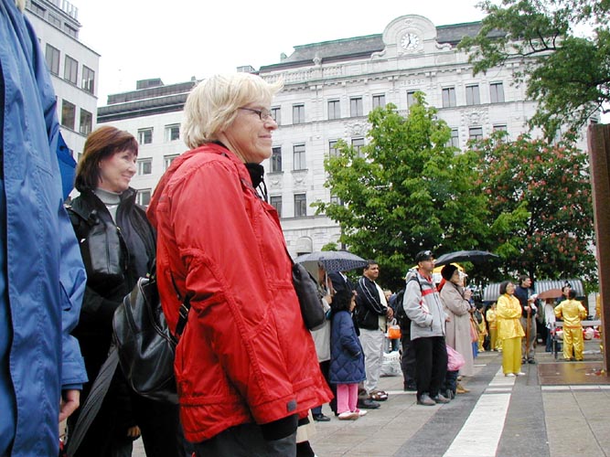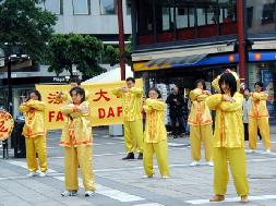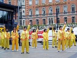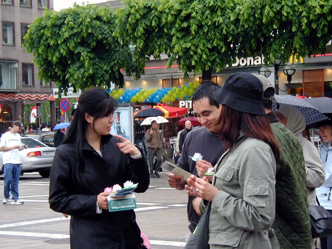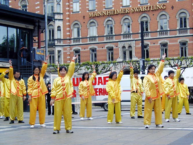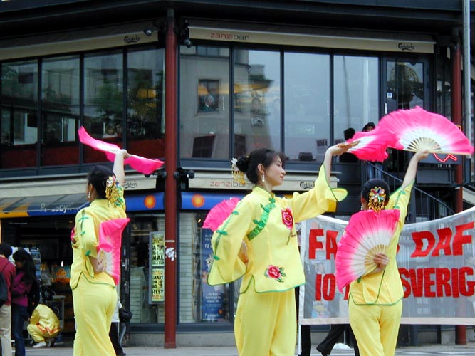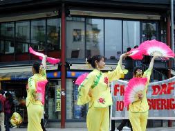 6月11日下午,部份欧洲学员在市中心为斯德哥尔摩的民众進行了表演。在腰鼓队喧天的锣鼓声过后,欧洲的飞天舞蹈团给观众们带来了他们的传统保留节目《莲花颂》、《飞旋的法轮》和新编排的舞蹈表演。优美的炼功音乐和功法,令行人纷纷驻足观看,高兴的收下学员递上的法轮功真象资料和精心制作的纸莲花,有些观众还当场跟着学员炼起了功法。