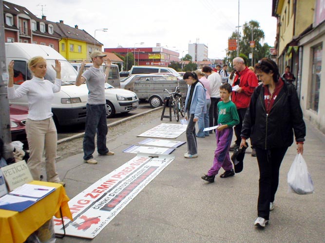 【明慧网2005年6月16日】2005年6月11日,斯洛伐克的法轮功学员们来到西部的小城市—玛拉其(Malacky),在市中心的Mierove广场举办洪法活动,展示功法,征集签名,发放真象传单,告诉那里的居民们发生在中国大陆已经持续了近6年的残酷迫害。