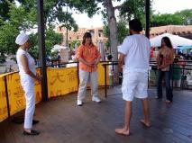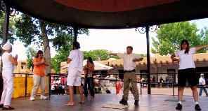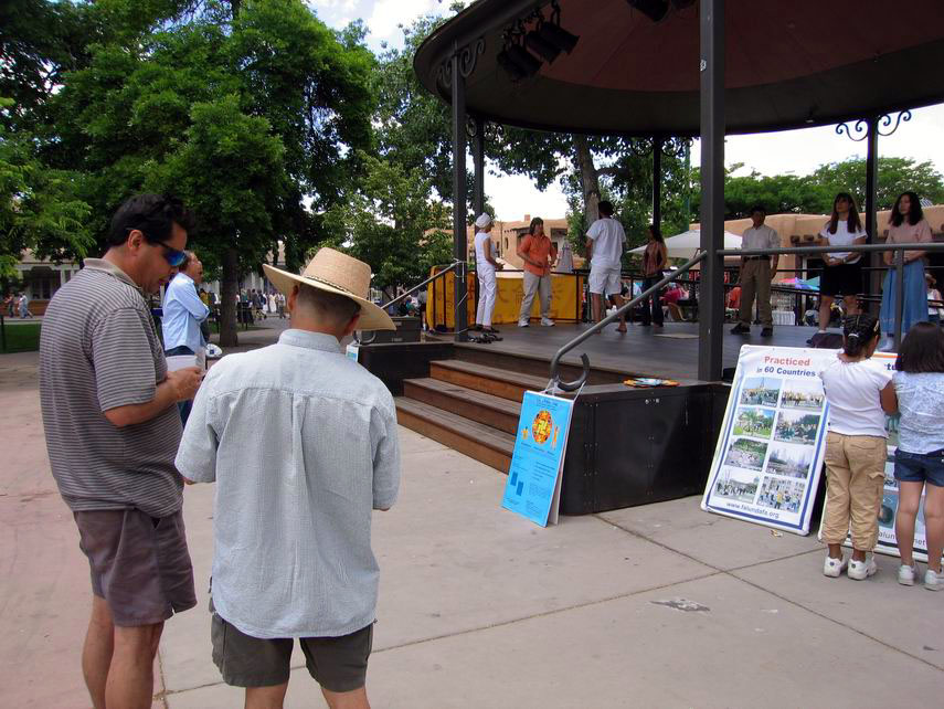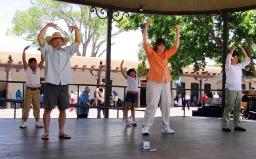 【明慧网2005年6月17日】圣塔菲(Santa Fe)是美国西南部新墨西哥州的首府,也是美国著名的第二古城。2005年6月11日,来自新墨西哥和科罗拉多州的法轮功学员们在市中心的广场演示功法,吸引了许多市民及游客的注意。有不少当场就来学功,几个小朋友迫不及待的和演示功法的学员一起从头到尾炼完了五套功法。