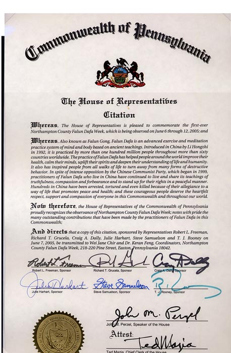 现将这份由众议员罗伯特•福利曼(Robert L. Freeman), 里查德•格里斯勒(Richard T. Grucela),克瑞格•戴里(Craig A. Dally),朱利叶•哈波特(Julie Harbart),史蒂夫•山姆森(Steve Samuelson)和卢尼(T. J. Rooney)于2005年6月7日共同发起的褒奖书的复印件传送给北安普敦县法轮大法周协调人魏•简爱•卡尔(Wei Jane Chir)和冯克然博士(Keran Feng)。
