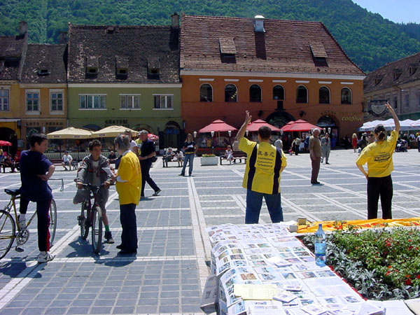 有的学员向过路的游客发法轮功真象资料介绍什么是法轮功,并揭露中共邪党利用手中的权力,残酷迫害坚持修炼真、善、忍的无辜法轮功学员。过路的游客们纷纷停下来,欣赏功法演示并观看揭露中共邪党迫害修炼者的真象图片。