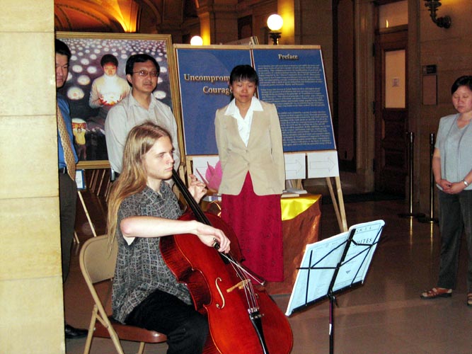 一位在政府部门工作的韩国女士,在休息时间下来观看画展。这位女士以前没有听说过法轮功,明白了真象后,跟学员们索要了所有种类的资料,还把每一幅画认认真真的看了一遍。当她看到《火烧炮烙》,《老虎凳》,《对妇女的迫害》,《灌食》等画时,她说:真不敢想象在中国现在还发生这样的事,这比希特勒的酷刑残酷好几倍,希特勒只能站到一边去。她说:她回去以后,会读所有的资料,还会看法轮功的网站。