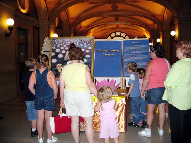 还有一位议员,当4四岁半的小弟子把所有的资料整整齐齐的叠在一起递给她时,她特别高兴,还在别的议员面前显示,这样另外几位议员也主动过来跟小弟子要资料,还认真的读了资料。当这位议员要回家时,学员们正好在外面又碰到了她,她还特意从车上下来跟法轮功学员们说声“谢谢!”。