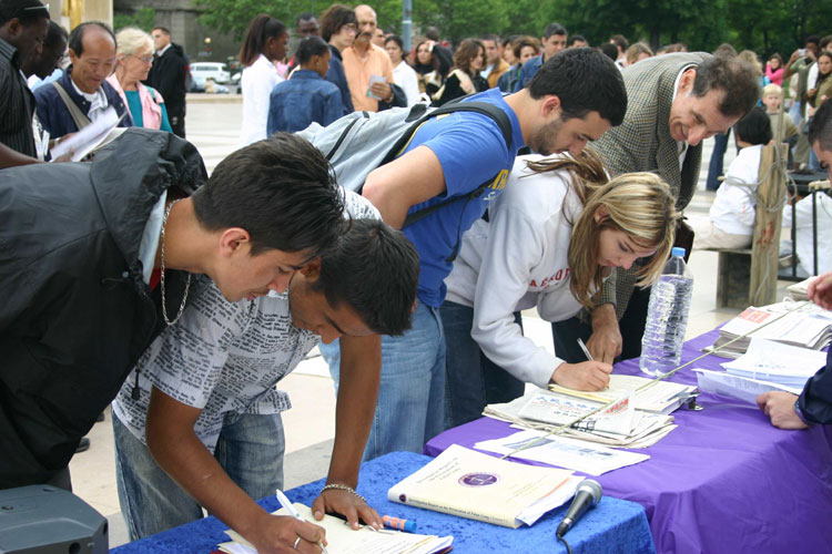 2005年6月5日星期天,新唐人电视台举行要求欧洲卫星公司抵制中共压力续约和声援两百万人退党的活动。新唐人电视台是一个勇于说真话的独立的电视台,法轮功真象是新唐人电视台报道的内容之一,因而部份法轮功学员也应邀参加了新唐人的活动,他们分别来自比利时、丹麦、瑞典、英国、德国等。他们以真人模拟的方式揭露中共江氏集团以酷刑迫害中国法轮功学员,现场还有图文并茂的展板,既展示了法轮大法在世界上洪传的盛况,又把中共迫害善良的大法弟子的真象暴露在光天化日之下。一批又一批的游客细细阅读展板的内容,其中也不乏当地的华侨和大陆游客。途经的游客对二十一世纪仍有如此残暴的迫害表示震惊,纷纷在征签布上签名以示支持新唐人电视台及支持信息自由、声援退党。