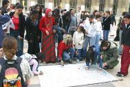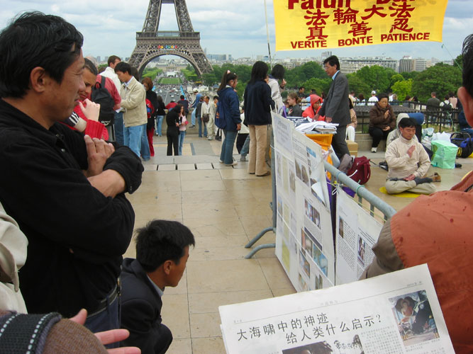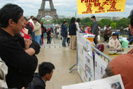 【明慧网2005年6月20日】艺术之都巴黎吸引了无数世界各地的游客,气势恢宏的埃菲尔铁塔是巴黎名胜之一,而在人权广场上能拍摄到铁塔的全景,因此这里游客云集,明媚的夏季游客更是熙熙攘攘。
