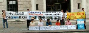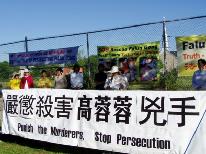 继6月20日惊闻法轮功学员高蓉蓉被毁容后又被迫害致死消息,芝城法轮功学员当天即在中领馆前举行抗议活动后,2005年6月21日,更多的学员再次汇集在领事馆前,抗议中共虐杀法轮功学员的残暴行为。