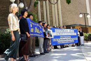2005年6月21日中午,美国圣地亚哥法轮功学员在市政府广场集会,悼念5天前被中共迫害致死的法轮功学员高蓉蓉,并强烈要求严惩迫害高蓉蓉的凶手唐玉宝和姜兆华。