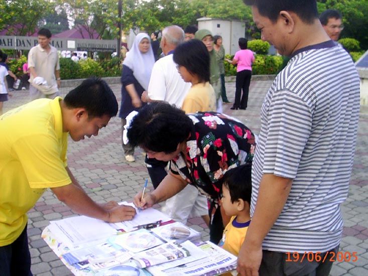 【明慧网2005年6月23日】为了让人们進一步了解中共对法轮功的目前还在延续着,马来西亚法轮功学员定于2005年6月19日早上,再次到人潮众多的雪兰莪州吧生市人民公园举行反展。在此之前,学员写了书信通知当地市政府。当学员去提交书信时,市政局的公关小姐一下就认得学员。学员跟公关小姐提起我们要再一次于人民公园办反酷刑展。公关小姐很开心的接收了书信。