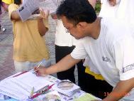 前来了解真象的民众马来西亚是个宗教信仰自由的国家,所以绝大多数的人民都有信仰,而且都相信善有善报,恶有恶报。当善良的人们无论男女老少,无论是任何种族:华人、马来人或者是印度人,当他们知道了中共运用毫无人性的手段迫害只为坚信“真善忍”的法轮功学员后,他们都毫不犹豫的纷纷签名反对中共对法轮功的迫害。有些人还谴责共产党真是没人性,什么事情都敢干。