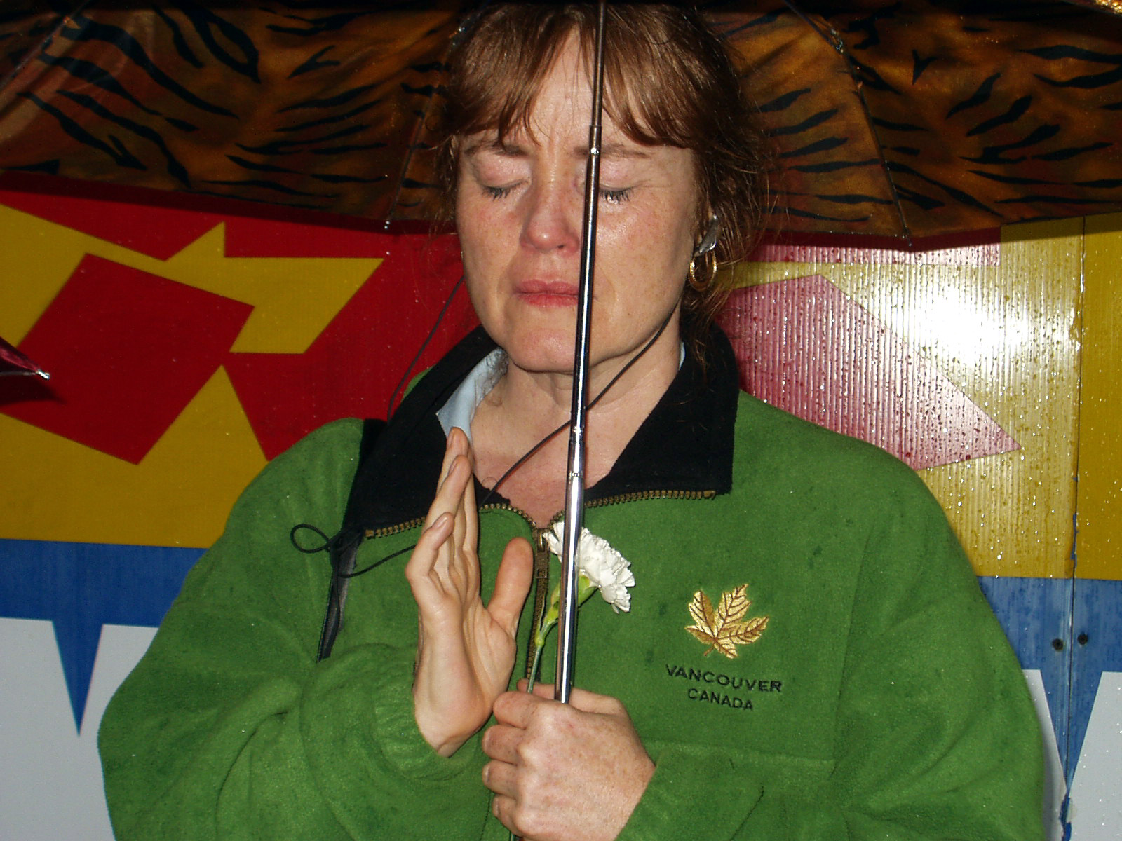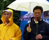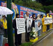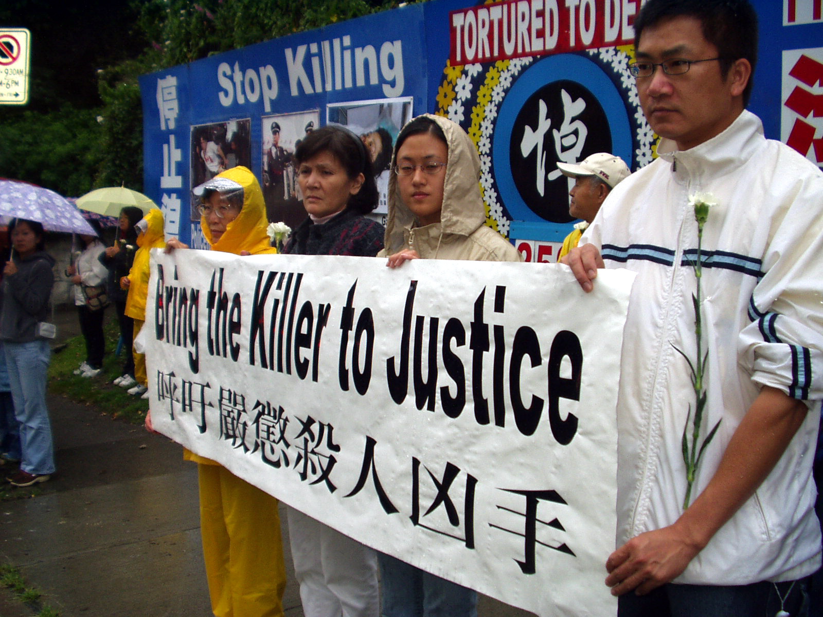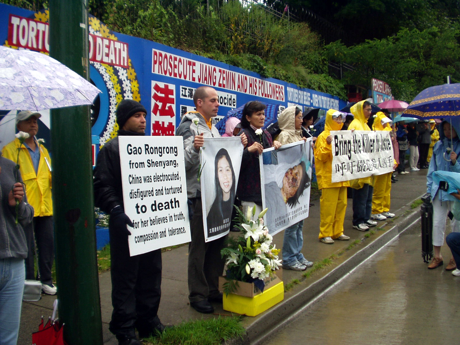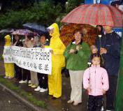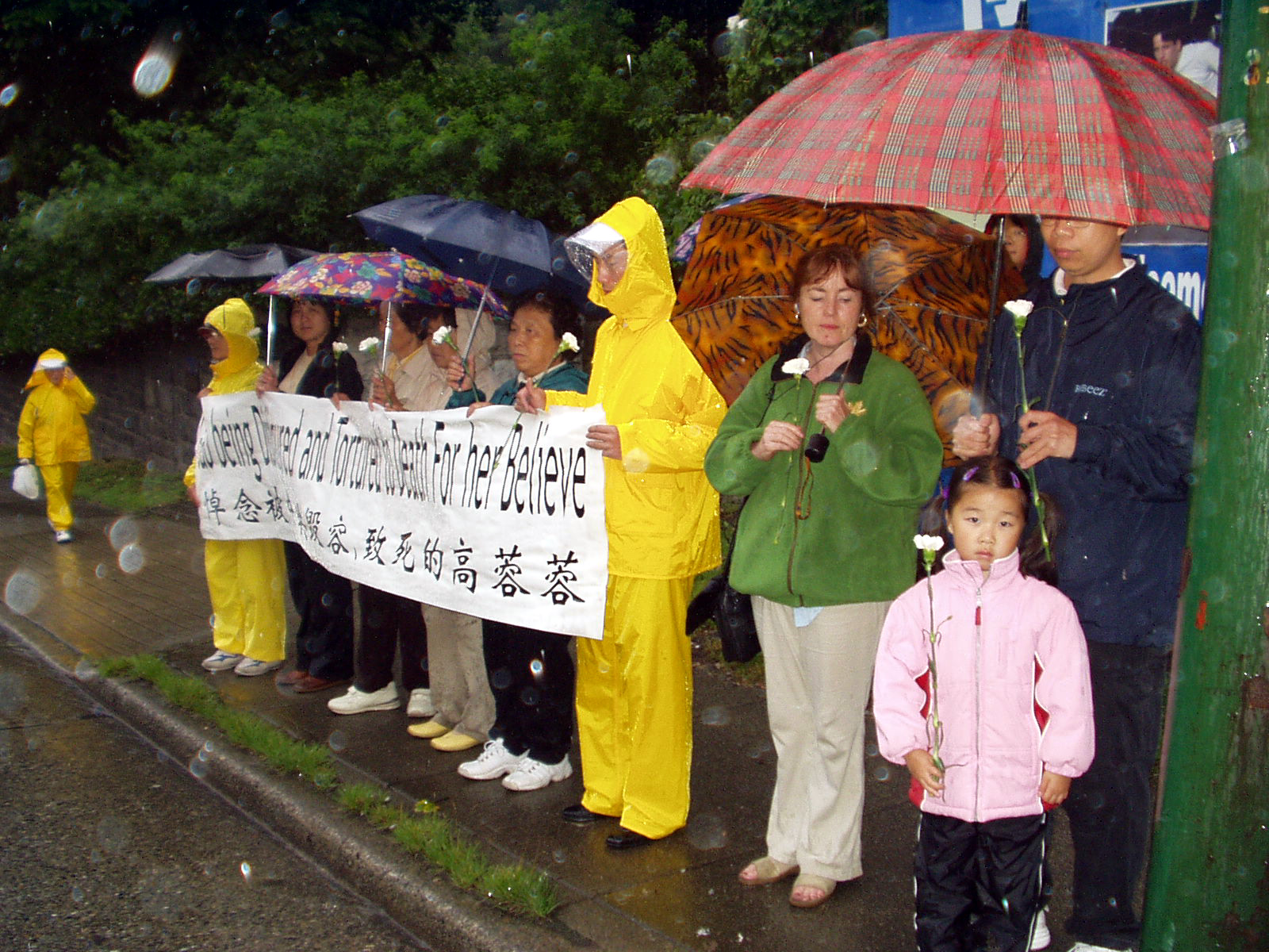 【明慧网2005年6月23日】(明慧记者李华报道)2005年6月21日,温哥华法轮功学员冒着大雨,汇集在中领馆前,抗议中共欠下的又一笔血债――曾被中共毁容的法轮功学员高蓉蓉6月16日被中共